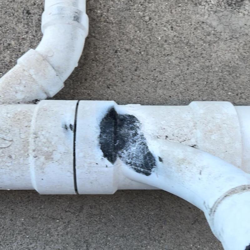 Valice Plumbing repaired a cracked 4-inch ABS main line in Stockton, California. The leak originated from an upper apartment and affected a hair salon below. Technicians replaced the damaged section 20 feet above ground and confirmed the repair by testing for leaks.