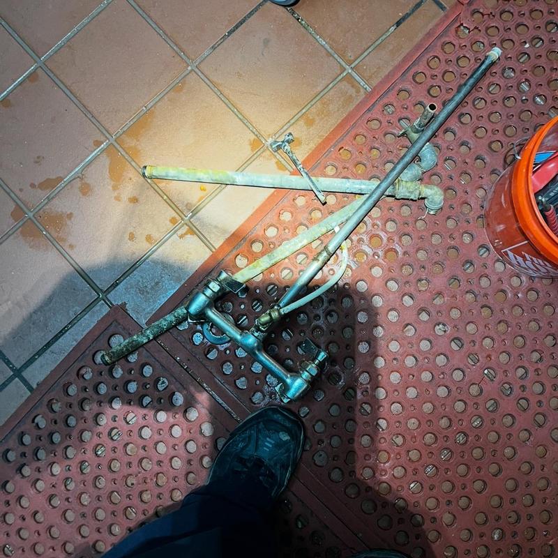 Valice Plumbing installed a new Fisher gooseneck faucet for a three-compartment sink at Casa Flores Restaurant in Stockton, California. The team removed the leaking unit, disconnected it from behind, installed new water supply lines, and restored water service.