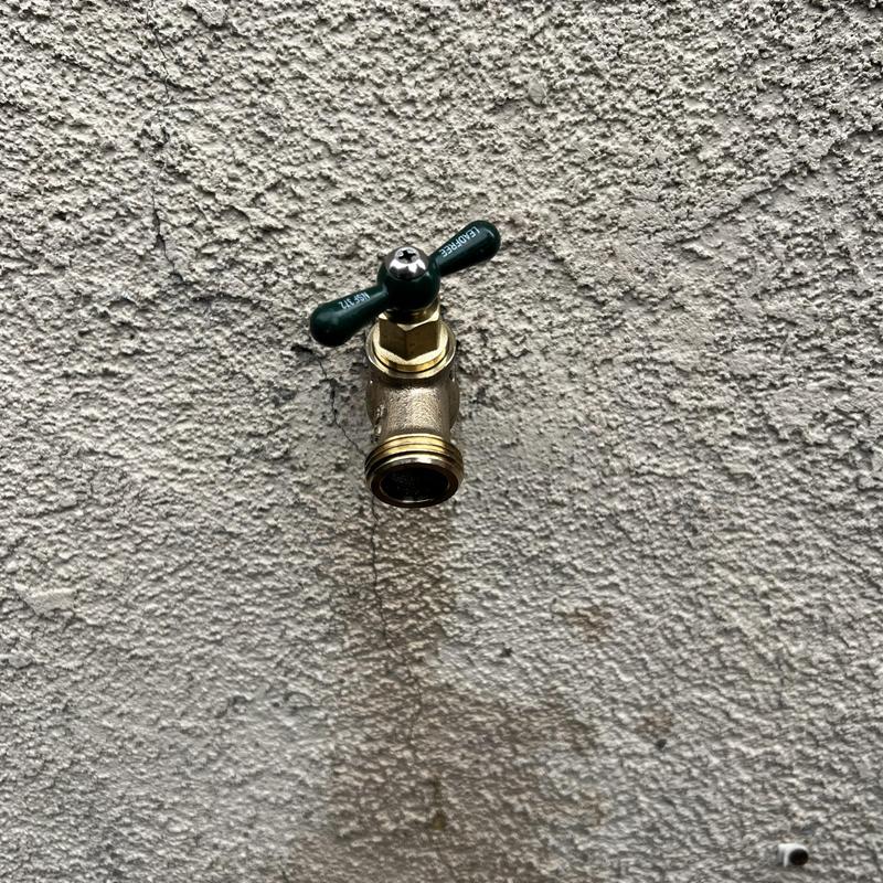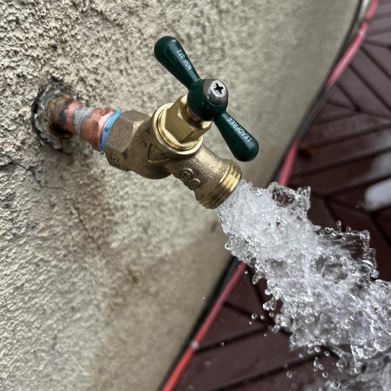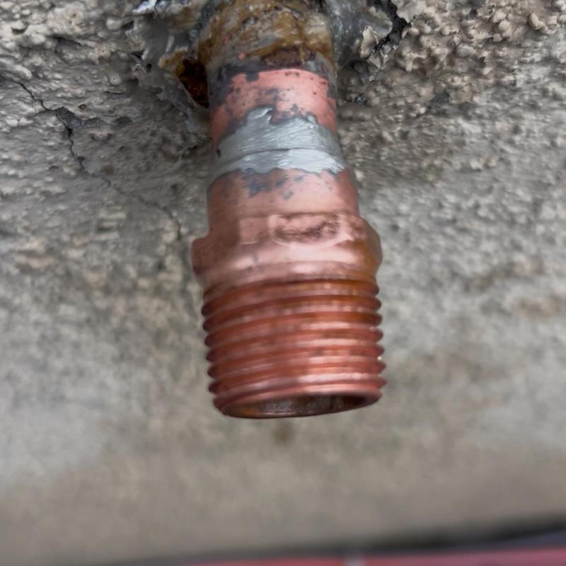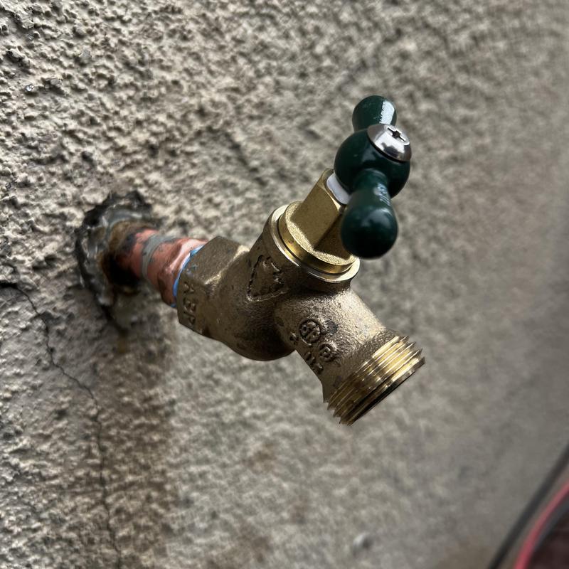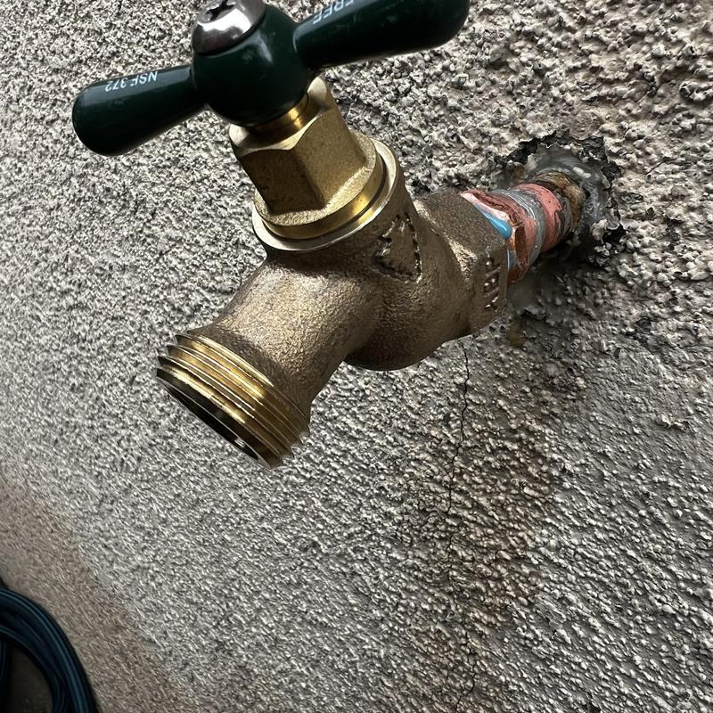 A plumber in Stockton, California repaired a leaking outdoor hose bibb. The plumber removed the damaged 12-inch hose, sanded the copper pipe, soldered a new male adapter, and installed a new 12-inch female hose bibb. Water service was restored after installation.