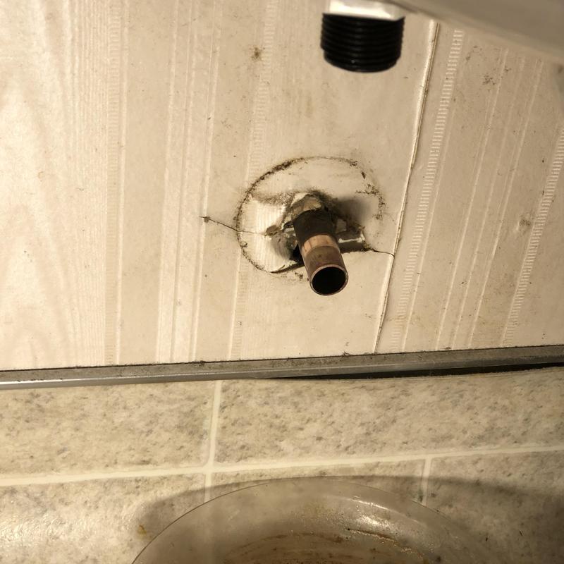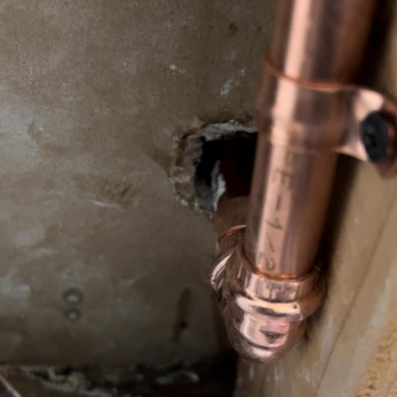 A plumber in Stockton, California repaired a leaking water line behind a toilet. The job involved cutting open drywall, removing a damaged ½-inch copper pipe, installing a new water line with wall straps, and replacing the angle stop valve. The plumber restored water service and resolved the leak.