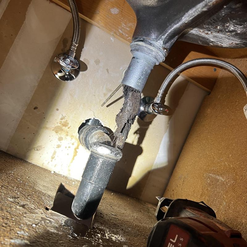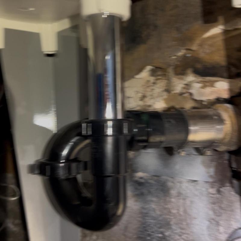 A plumber in Stockton, California removed a corroded waste and overflow assembly and P-trap under a tub. The team installed a new 1 1/2-inch P-trap and replacement waste and overflow system to restore proper drainage. Work included cutting and removing damaged components from beneath the house.