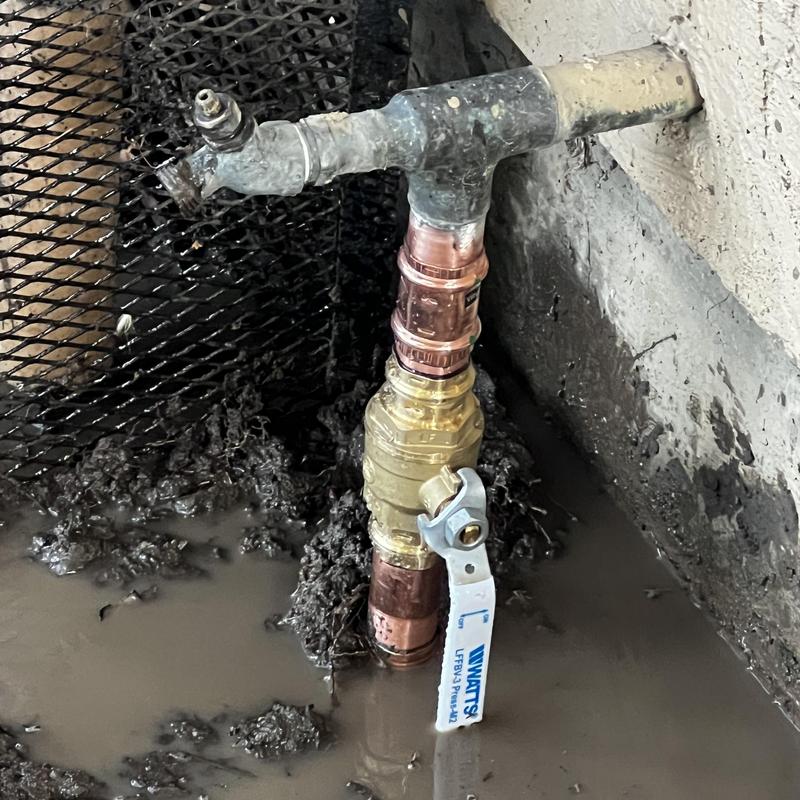 Valice Plumbing repaired a building's water main in Stockton, California. Technicians shut off the water at the meter, removed a leaking gate valve, installed two ProPress couplings, and added a new 1¼-inch ball valve. They restored water flow after completing the installation.
