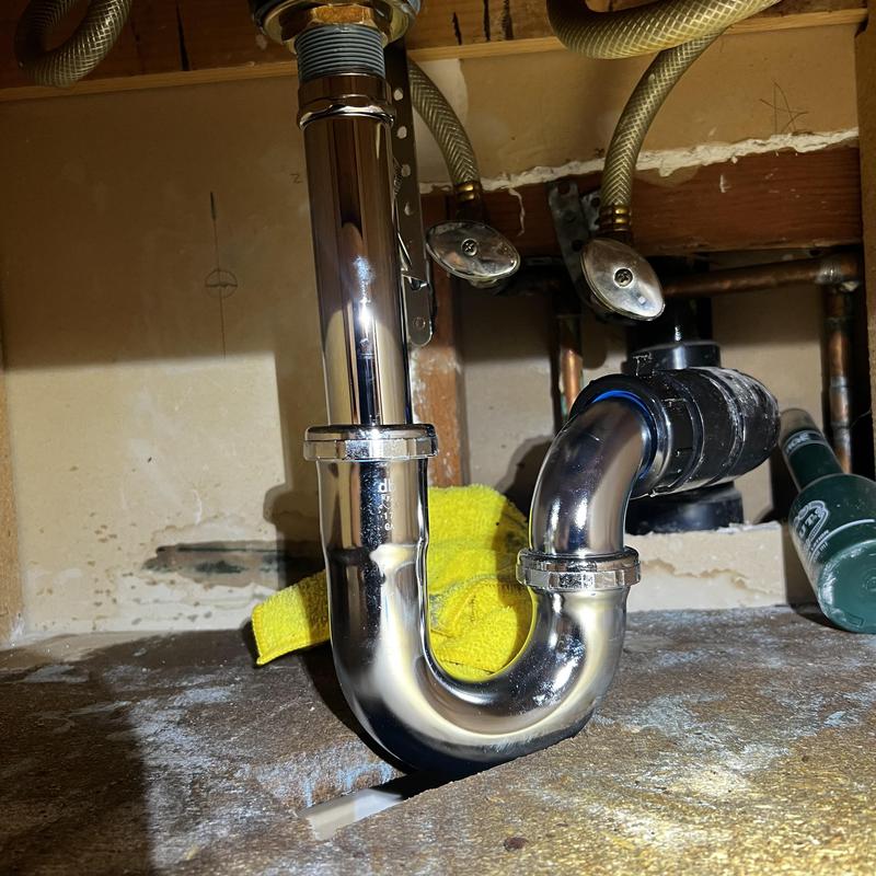 A plumber in Stockton, California replaced a leaking pop-up assembly under a bathroom sink. The technician removed the faulty parts, including the P-trap, and installed a new pop-up assembly. After reconnecting the P-trap and filling the sink with water, the system was tested to confirm there were no leaks.