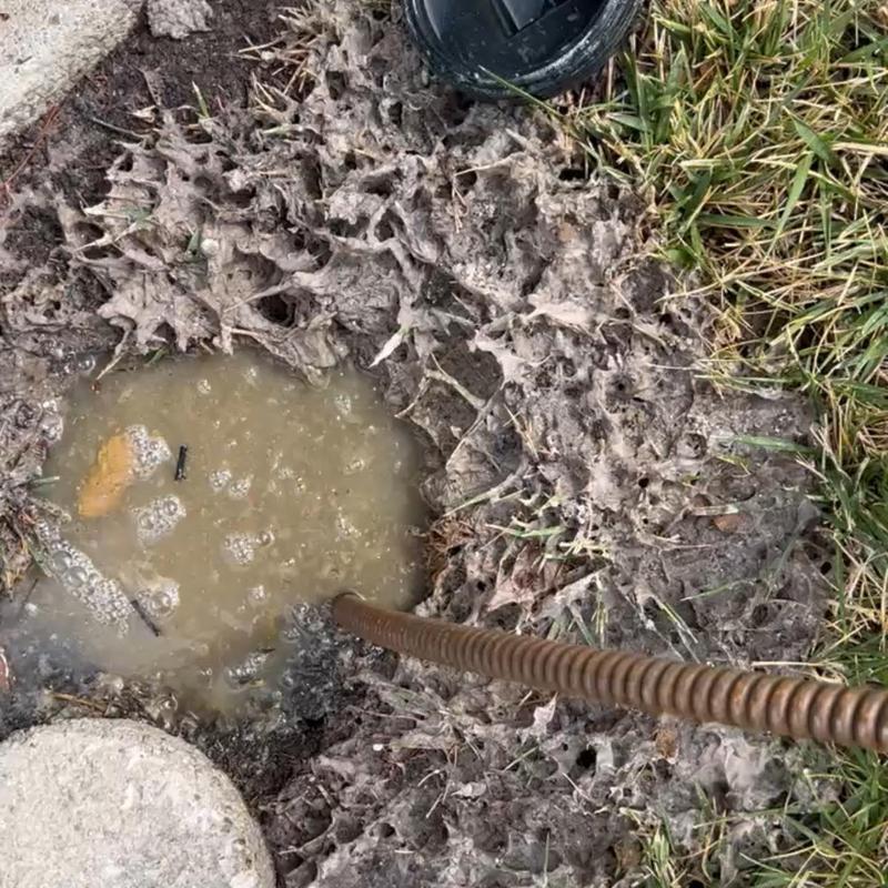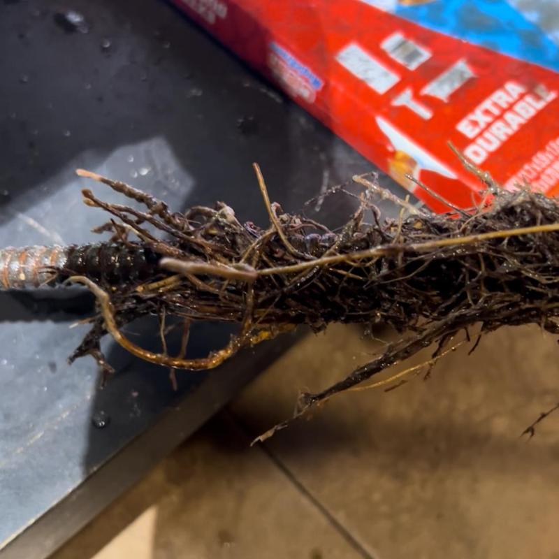 A plumber in Stockton, California cleared a blocked sewer main line using a snake. After restoring flow, they used a camera to inspect the pipe and identified extensive root intrusion causing the backup.