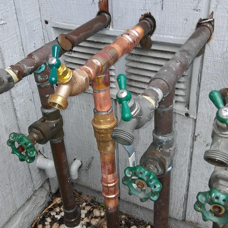 A plumber in Stockton, California repaired a leaking outdoor hose bibb. The plumber removed the damaged 12-inch hose, sanded the copper pipe, soldered a new male adapter, and installed a new 12-inch female hose bibb. Water service was restored after installation.