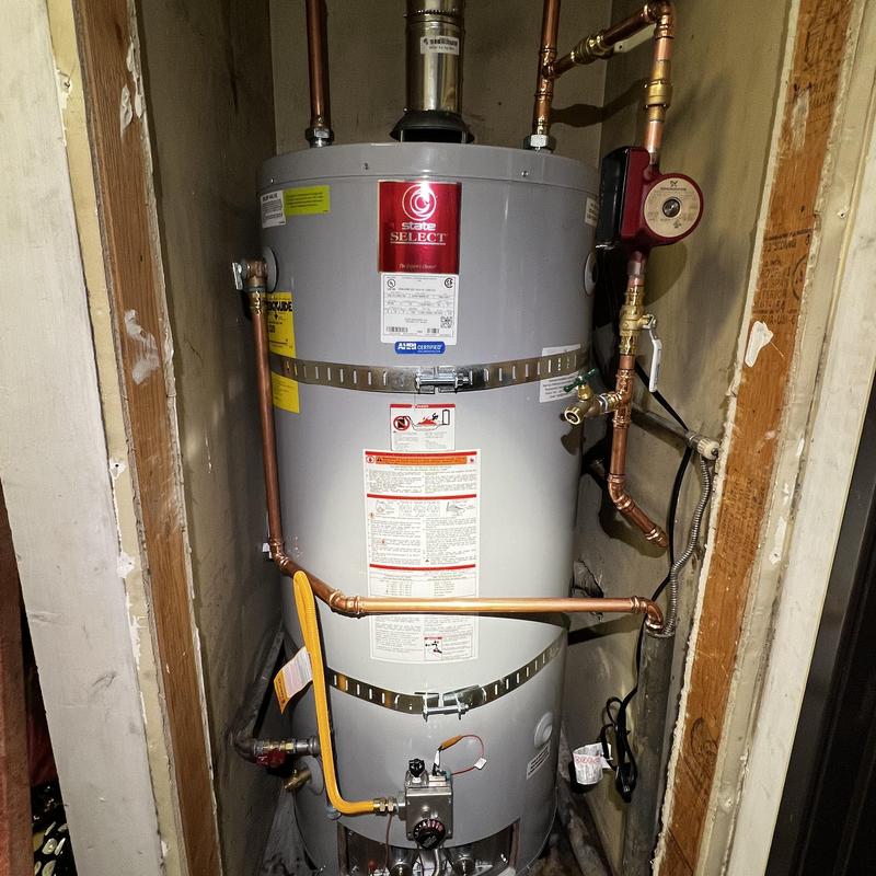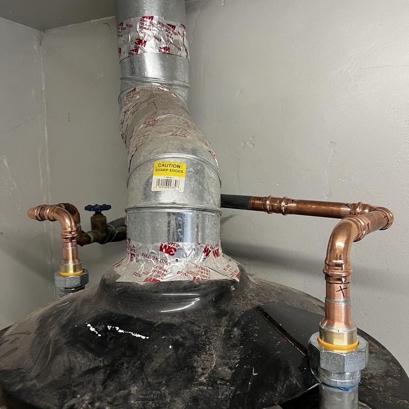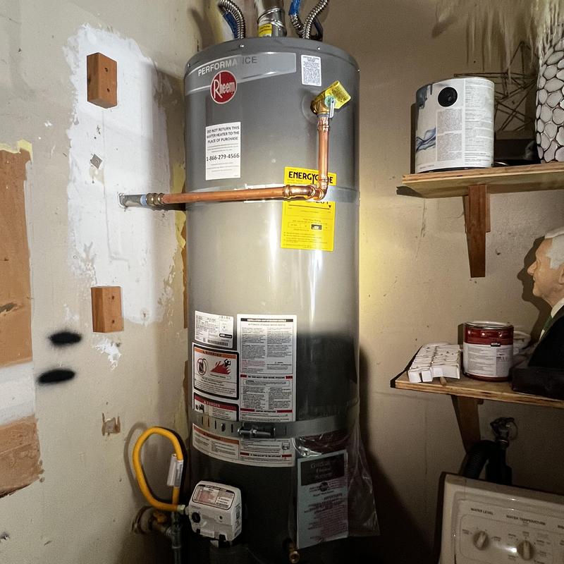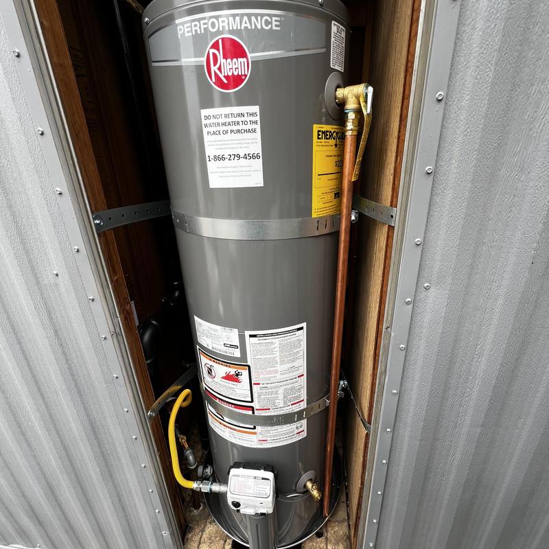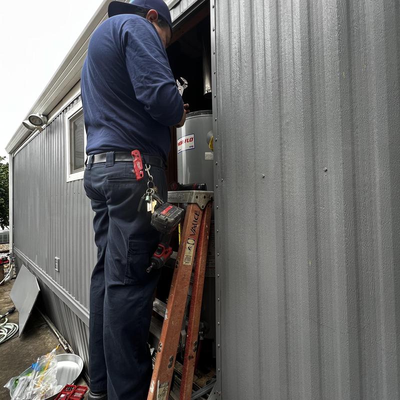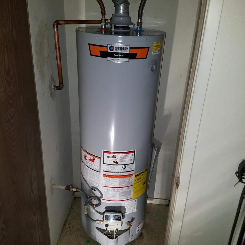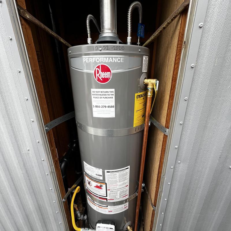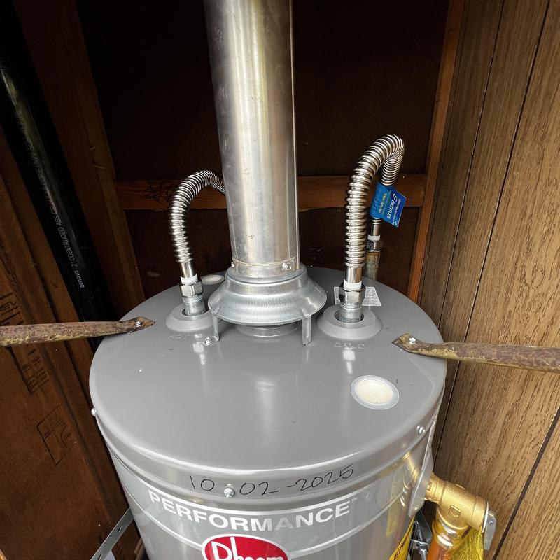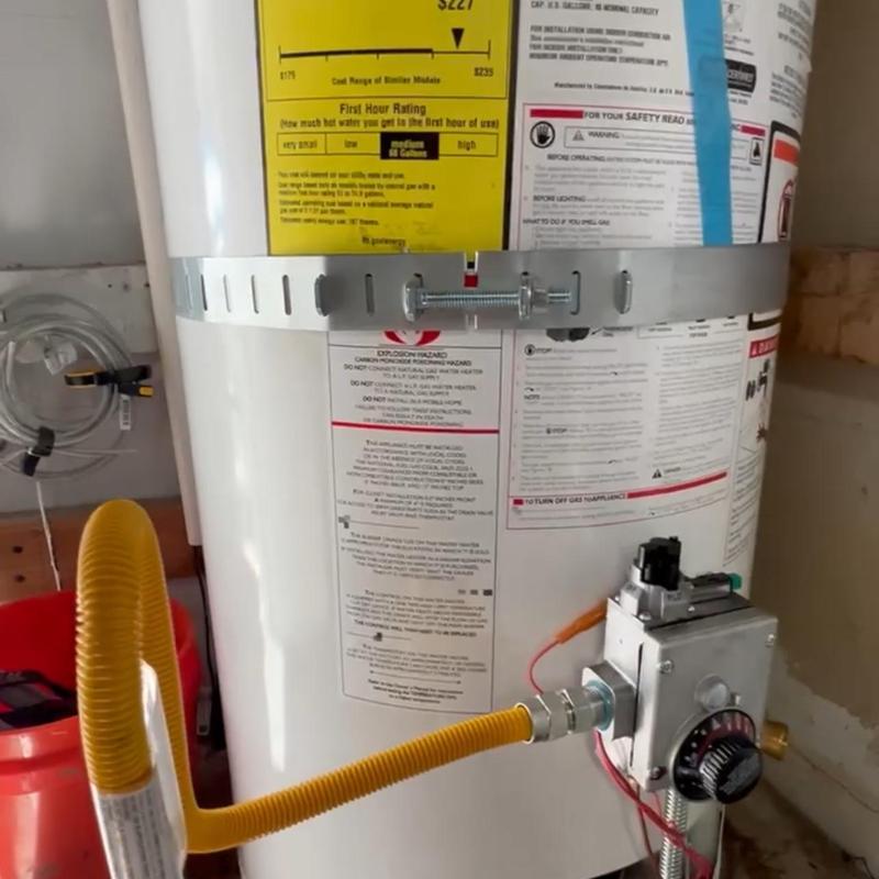 A plumber in Stockton, California removed a leaking water heater and installed a new 40-gallon unit. The service included a new vent, seismic straps, gas valve with flexible connection, sediment trap, and reconnection of a ¾-inch copper relief valve to ensure proper function and safety compliance.