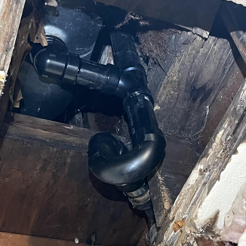A plumber in Stockton, California repaired a leaking 2-inch galvanized drain line beneath a raised foundation. The damaged section, located near a closet access panel, was removed and replaced with ABS pipe and two new bands. The system was tested after installation, confirming no leaks remained.