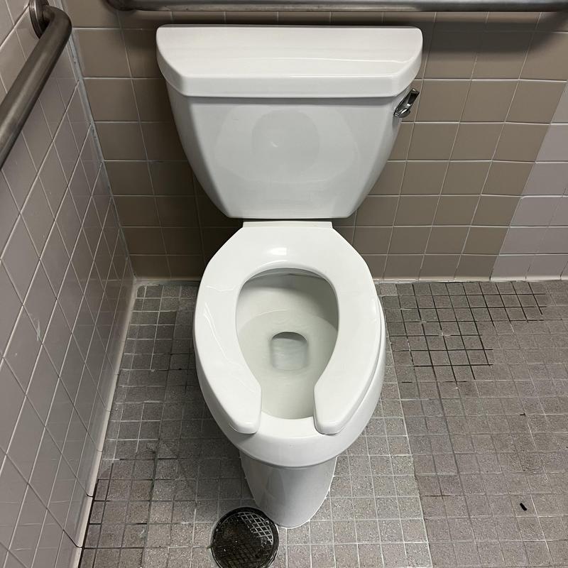 Valice Plumbing installed new plumbing for an ADA-compliant toilet at Valley Fitness in Stockton, California. The team replaced a wall-hung toilet with a floor-mounted model, updated the water line, poured new concrete, and installed grab bars and a Kohler power-flush toilet after tile work was completed.