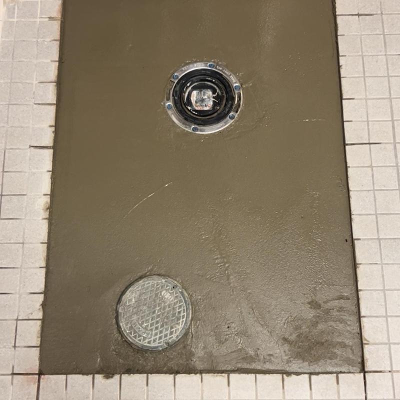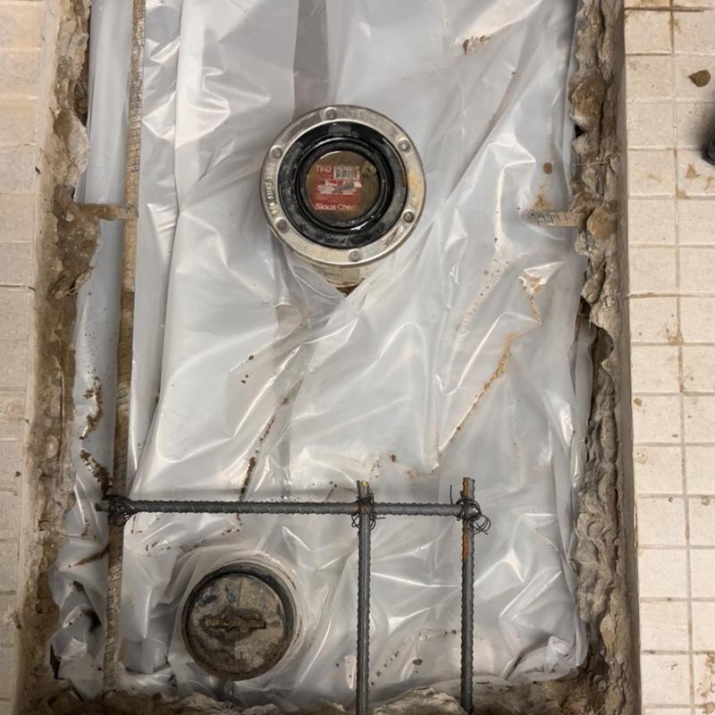 Valice Plumbing installed a new floor drain in the girls' restroom at Lincoln High School in Stockton, California. The team removed concrete with a jackhammer, cleared a 2-inch drain line using a snake, installed the new floor drain, and poured concrete to prepare the area for tile installation.