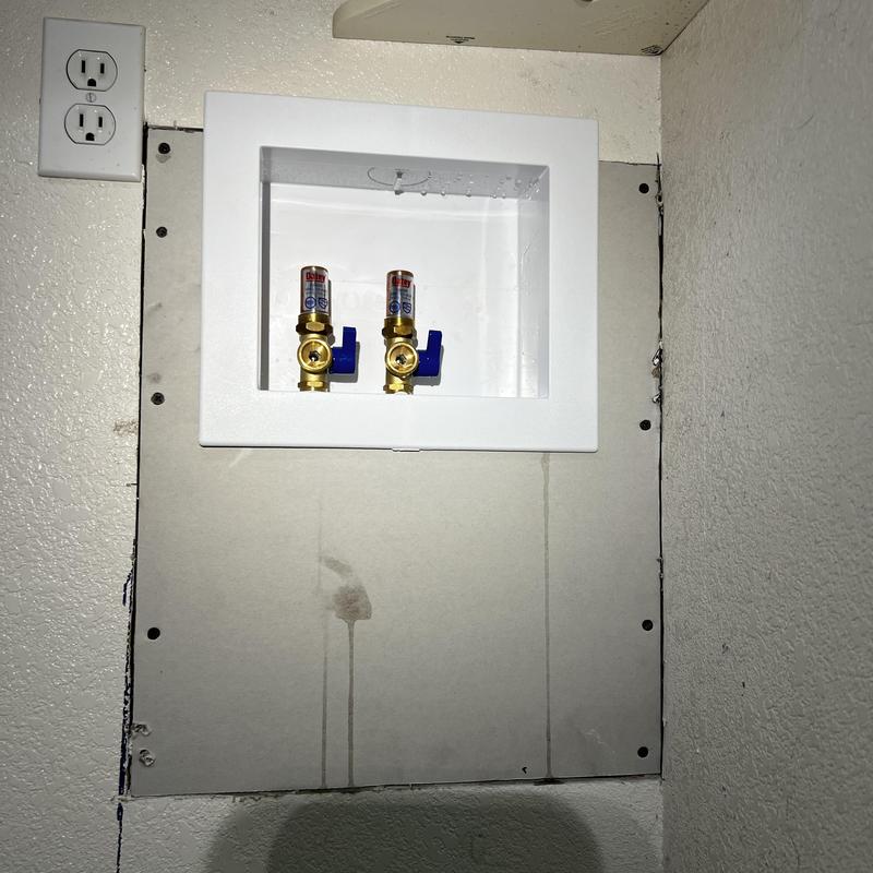 A plumber in Stockton, California installed a new washer box to fix low water flow to a washing machine. The job included removing the old box, soldering new water lines, installing a 2-inch drain, and restoring the wall with sheetrock and trim. Both hot and cold water tested at proper pressure.