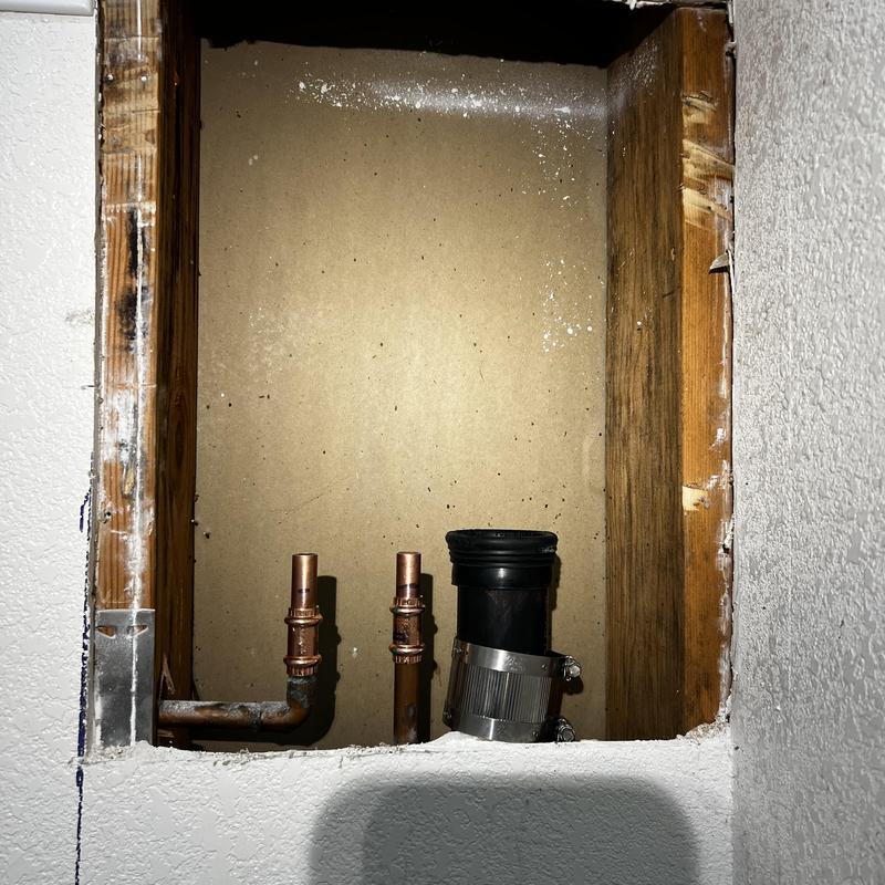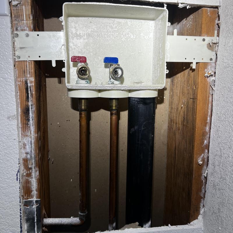 Valice Plumbing installed a new washer box in Stockton, California. Technicians removed damaged sheetrock, replaced punctured drain pipes, upgraded to new ABS piping, soldered fresh water lines, and added two cleanouts to improve access. The project addressed a leak and updated outdated plumbing during the wall opening.