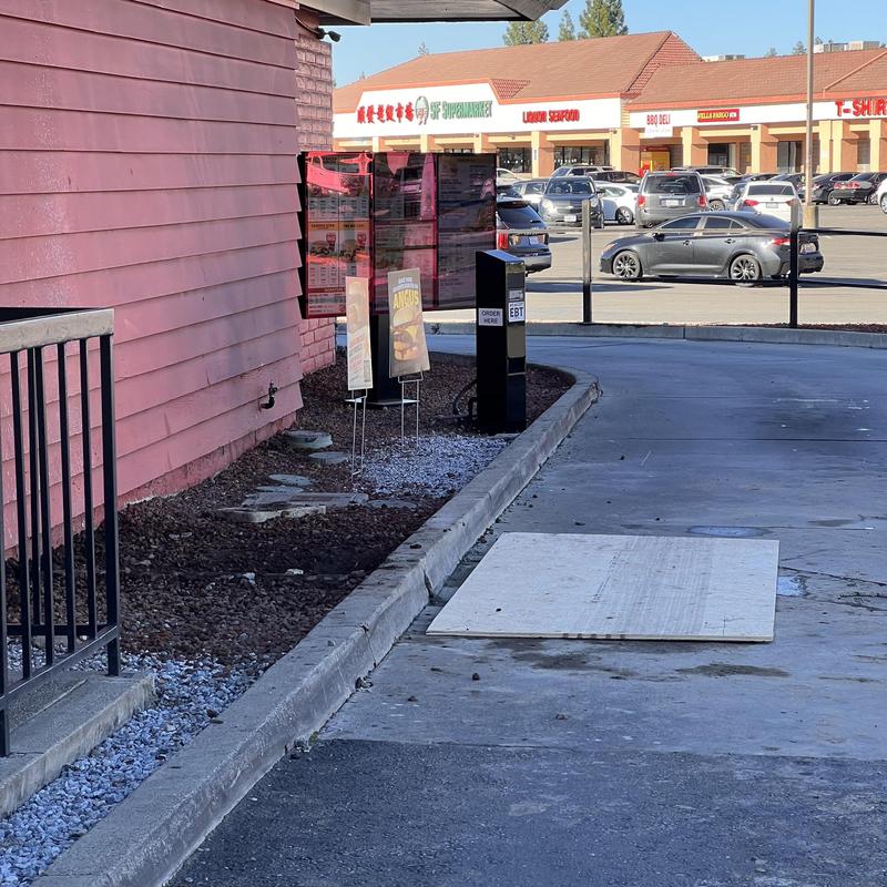 Valice Plumbing repaired a collapsed main drain line at Carl's Jr. in Stockton, California. Technicians cleared the blockage, inspected the line with a camera, removed eight feet of damaged pipe using a jackhammer, installed new ABS piping, backfilled the trench, and poured new concrete to restore the area.