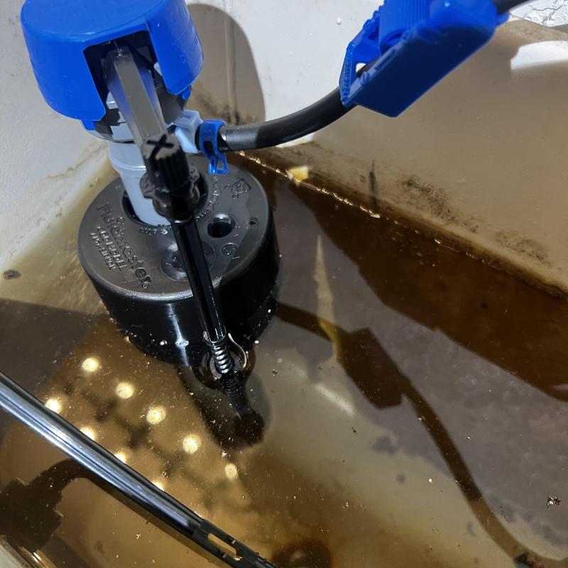 A technician replaced a faulty toilet fill valve in Stockton, California. The old valve caused water to leak from the tank. The technician installed a new fill valve and tested the flush to ensure proper function.