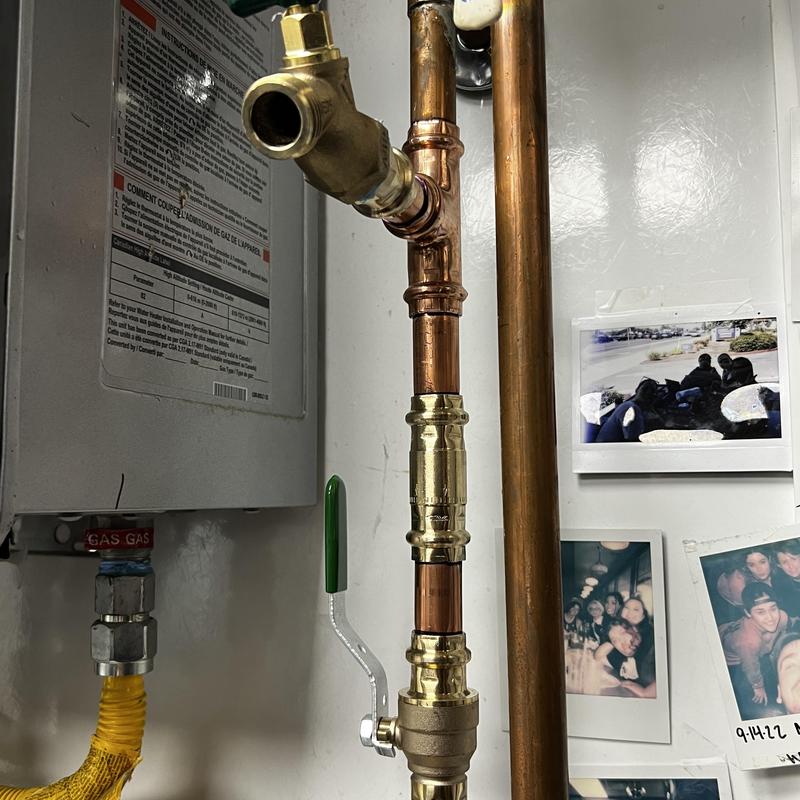 A plumber in Stockton, California installed new descaling valves on a tankless water heater. The technician removed the existing hot and cold water lines, added descaling valves, reconnected the water lines and the T&P relief copper line, and completed a full descaling of the water heater system.