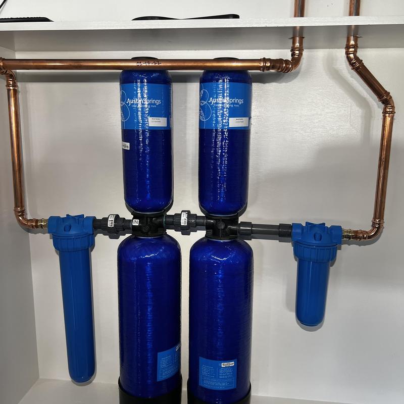 Valice Plumbing installed new Rhino water filters in Stockton, California. The team connected the filters by running a new inlet from the main hard water line and a new outlet for soft filtered water back to the main. They used copper piping with ProPress fittings to complete the installation.