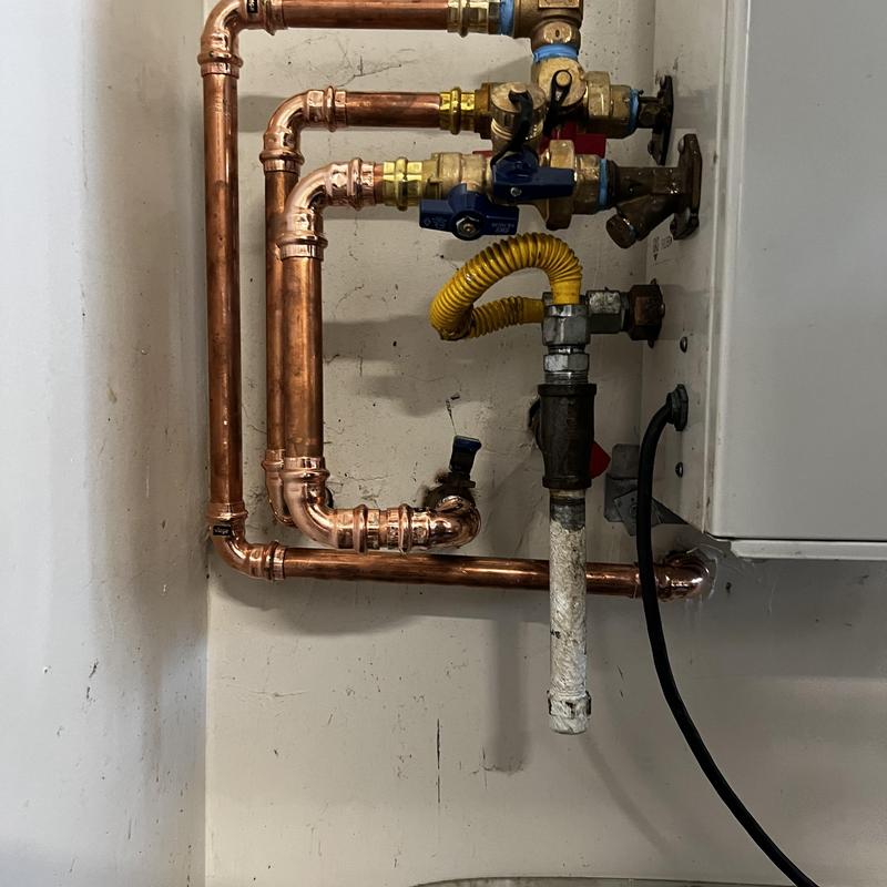 A plumber in Stockton, California installed new descaling valves on a tankless water heater. The technician removed the existing hot and cold water lines, added descaling valves, reconnected the water lines and the T&P relief copper line, and completed a full descaling of the water heater system.